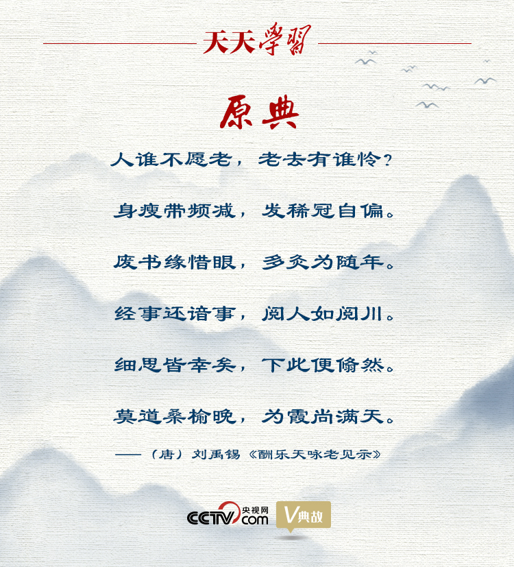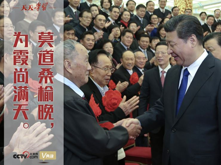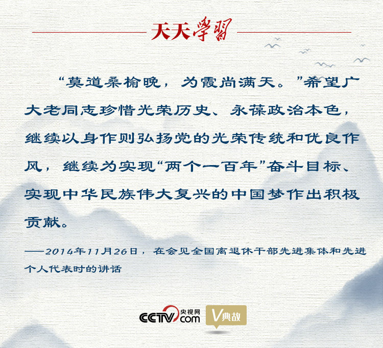 “莫道桑榆晚,为霞尚满天。”2014年11月26日,习近平总书记在会见全国离退休干部先进集体和先进个人代表时,用刘禹锡的诗句鼓励广大老同志继续发挥余热,作出积极贡献。