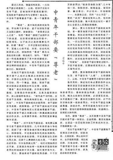 1984年12月7日,习近平同志在《人民日报》发表一篇题为《中青年干部要“尊老”》的专论,文章充满深情地说:“千千万万的老同志,‘投身革命即为家’,几十年如一日,勤勤恳恳,兢兢业业,艰苦朴素,廉洁奉公,不计名利,不怕牺牲……,在离休之后,仍然‘壮心不已’,要把‘余热’奉献给党和人民。他们的种种优秀品德,集中表现出他们一辈子全心全意为人民服务的精神。”