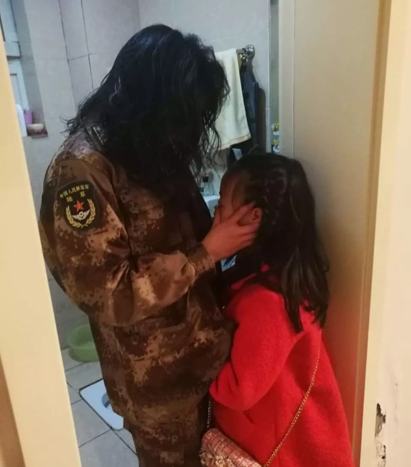 启程前夕,拂去孩子眼角的泪水:“宝贝不哭,妈妈要去帮助更多人!”。(图片来源:人民陆军微信公众号)
