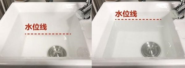 此外,我们来看看放掉的冷水,左图刚刚没过台盆底部,而右图则放了满满一台盆的冷水。