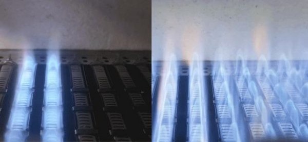 A.O.史密斯L1PB-V9新一代零冷水型采暖炉便使用了全新的五段式燃烧技术来保障舒适体验。从最小两排火到全排火的全新五段式燃烧技术,采用小火燃烧方式预热生活用水(如左图),管道温度均匀,沐浴出水温度更精准,夏天小火燃烧水不烫,冬天大火燃烧大水量的舒适沐浴体验。而常规大火预热方式(如右图)则容易导致管道中水温过高,出现打开龙头出“烫”水的情况,沐浴体验欠佳。