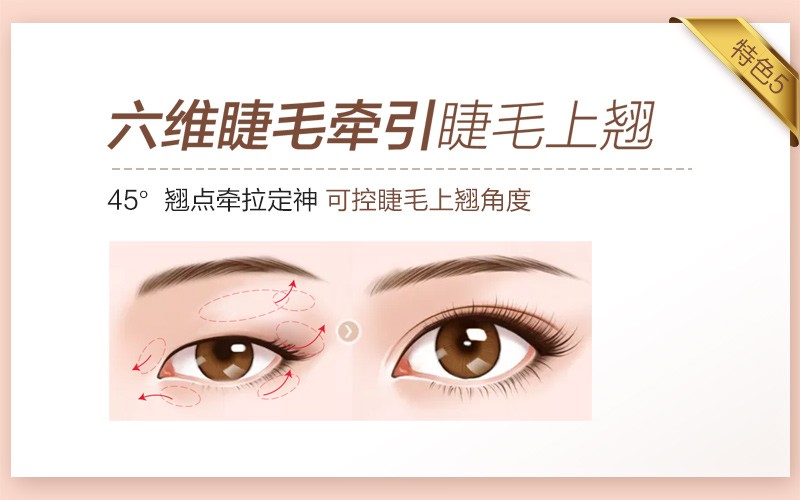 5、综合眼部神韵焦点,灵动平衡点,眼尾仰点等六维睫毛牵引,达到四十五度翘睫灵动的效果;