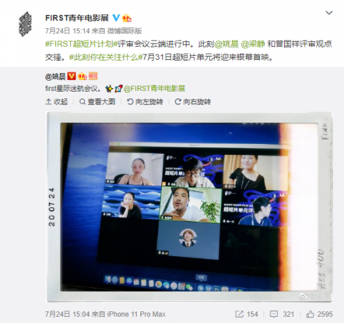 作为FIRST青年电影展的一大看点,超短片单元为电影创作者提供了技术与设备的新可能,也为电影创作者提供了新的赛道和机会。而作为FIRST青年电影展的官方战略合作伙伴、超短片的单元的联合发起方,vivo也在今年6月初面向所有的用户及青年创作者发出邀请,鼓励使用vivo手机以“不虚此刻”为主题进行创作,旨在进一步探索手机设备与电影创作边界。7月15日,FIRST青年电影展在官方平台公布首次超短片单元的入围名单,特邀评审团的各位明星大咖以云相聚的形式,参与评选最佳作品同时,畅谈未来手机电影发展,为中国电影建设建言献策。
