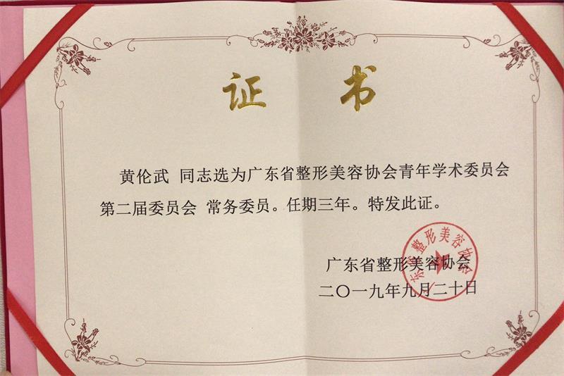 广东省整形美容协会青年学术委员是广东省整形美容协会新成立的一个分会,主要是以整形美容学术研讨和增进学术交流为主,当选的委员都是具有整形美容学术专长的青年专家学者。黄伦武主任参加了2019年举办的第二届委员会,在会议上作了精彩的学术报告,并成功当选为广东省整形美容协会青年学术委员会第二届委员会常务委员,任期三年。