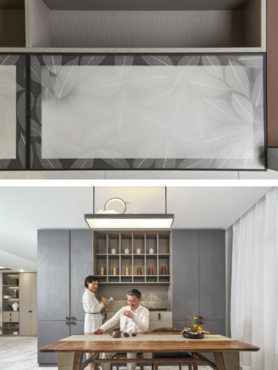 柏厨2020年上线的多款集成家居系列产品更是主推国风,极大地推动了国风的回归以及提升国货的品牌自信力。以集成家居“云涧”系列为例,设计师们将中国传统文化和现代家居完美高度融合,从博大精深的中国文化里精心挑选出图章、山水田园、茶、瓷器等等元素,运用精湛的设计技艺将其和家居融为一体,最终成就了“云涧”。章法天成的柏厨印;入则隐,出则仕,充满玄机的玄关;厨房细节寄情于玉兰叶,含蓄的东方味道,在云里若隐,于山涧若现;中西合璧的餐边柜,20年国酿在最显眼处,名家特制的景德镇餐具,微醺欲醉的红酒,藏着尘封往事,酒香故事多;于茶室书房中寄托情怀,笔墨丹青中肆意人生。