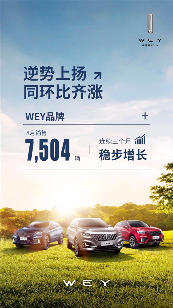 在这场风起云涌的车市之争中,WEY品牌作为第一个冲击高端豪华的中国汽车品牌,正在实现逆势上扬。8月销售7,504辆,1-8月累计销售41,234辆,其中智能安全旗舰VV6销售4,453辆,同比上涨3.3%,环比大涨21.9%;VV7销量同比劲增37.2%,环比增加3.5%,更为值得一提的是,诞生仅三年多的WEY品牌,已经斩获了36万+车主的青睐,“爆发生长”的速度不可小觑。