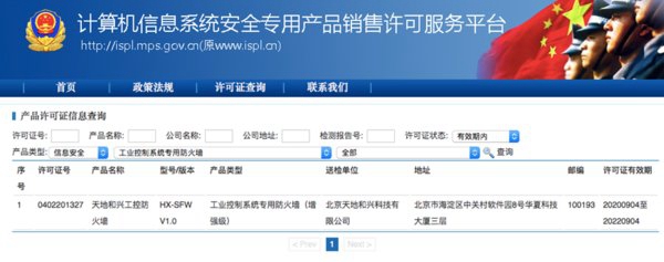 从美通社获知,近日,天地和兴旗下“地盾”系列工控防火墙顺利通过公安部计算机信息系统安全产品质量检测中心测试,取得工业控制系统专用防火墙(增强级)销售许可证(以下简称销售许可证)。天地和兴作为国内工业网络安全领航者,凭借其在工业网络安全领域深耕数十年的服务经验,不断精雕细琢各类工业网络安全产品,以求给用户提供更好的使用体验。工控防火墙作为天地和兴旗下防护类主打产品,拥有国内领先的工控协议深度内容检测技术。天地和兴能够在国内第一个取得工业控制系统专用防火墙(增强级)销售许可证,不仅仅代表国家相关部门对天地和兴安全产品的认可,更是天地和兴综合实力的体现。