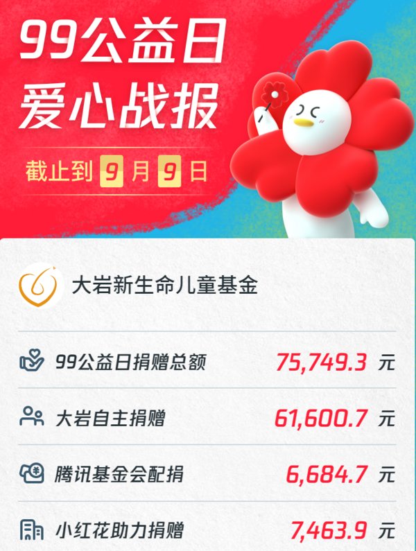 这是腾讯99公益日的第六个年头,也是大岩人一块参与其中的第三年。截止活动结束,“爱让我们挺直脊梁”项目获捐赠总额140355.19元,其中,由大岩新生命儿童基金发起的募捐队伍获捐赠总额为75749.3元,大岩员工自主捐赠共61600.7元,腾讯基金会配捐6684.7元,小红花助力捐赠7463.9元。