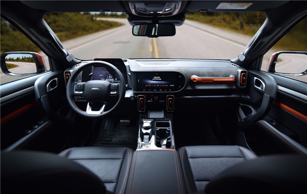 跟工作人员沟通后,我选了橙色的哈弗大狗试驾,相较于白色来说,它显得更运动。坐进座舱,橙黑的撞色设计十分惊艳,内饰座舱真·亿点点细节:副驾驶座舱的扶手,以及扶手下面放手机或者资料的空间都很贴心,另外,旋钮下方、车门两侧,也有诸多空间,让我们手里的东西可随取随放。而且哈弗大狗还支持无线充电,方便不少。