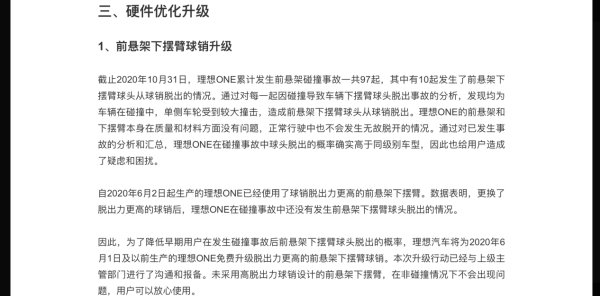 如此大胆又直白的公开10起“疑是“断轴””事件的理想ONE客观存在的问题,难道理想汽车不怕网友带节奏,对理想汽车“讨伐”吗?关于这个问题,我想理想汽车自身也是经过深思熟虑的,像以往其他品牌发生一些“负面事件”,官方总是刻意回避,不正面回答,而理想汽车敢于给予回应,一定是理想汽车对自身足够有信心,对用户足够信赖。先前理想ONE这款车的用户满意度就高达98%,远超同级车型的用户满意度;如今在理想汽车在承认前悬架下摆臂的球销脱出力不够高的同时,也给出响应的解决方案,比如今年6月1日起生产的理想ONE出厂时就升级了球销脱出力更高的前悬架下摆臂,目前这些车型都未出现下摆臂脱落的情况,足以证明新的球销脱出力更高的前悬架下摆臂是值得信赖的;另外,6月1日之前生产的理想ONE,老用户可免费升级球销脱出力更高的前悬架下摆臂,那么等陆续升级新的球销脱出力更高的前悬架下摆臂之后,理想ONE疑是“断轴”事件也就烟消云散了。