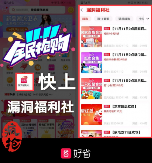 双11这个原本略显孤单的“光棍节”已经被各大电商平台与品牌联合打造成了一场消费者的狂欢。更多的品质好物、更炫的爆款计划、更大的亿级红包……各大电商平台都铆足干劲,希望用更有趣、更新奇的玩法吸引消费者的注意力,更有今年超快的发货速度加持,引爆极致的购物体验。作为以优惠和福利为底层运营逻辑的导购型电商,好省APP怎么能够缺席双11的狂欢Party!不用为买买买剁手,只有继续gogogo的持续加血,好省APP的福利供给一直不停歇!