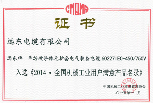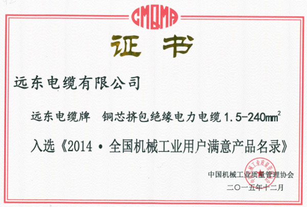 远东电缆两项产品荣获“全国机械工业用户满意产品”称号