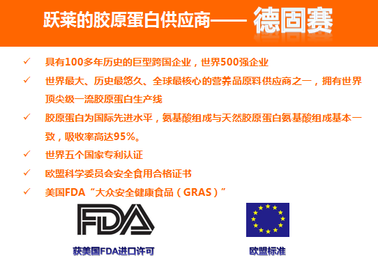 德固赛集团是一家具有100多年历史的巨型跨国企业,也是世界500强企业,总部设在德国杜塞尔多夫。集团下辖21个业务部门,全球员工总数达4.8万人。是世界最大、历史最悠久的营养品原料供应商之一,营销网络遍布全球。德国最先进技术和生产工艺,以及德国人在工作中讲求效率,注重纪律,一丝不苟,是产品质量的最佳保证,其产品特点有:(1)平均分子量小,各项指标均为国际先进水平,氨基酸组成与天然胶原蛋白氨基酸组成基本一致,表明很好的保持了其生物活性,因此,其吸收率高达95%;(2)性质温和,没有任何异味;(3)不含脂肪、碳水化合物、嘌呤、胆固醇;(4)无任何添加剂、防腐剂、色素、香精等。并且德固赛胶原蛋白通过了世界五个国家专利认证和许多国家政府管理部门的承认,获得了欧盟科学委员会确认的安全食用合格证书,美国FDA“大众安全健康食品(GRAS)”的批准,以上产品的质量与特点,符合了跃莱的产品理念“安全、有效、天然、创新”,跃莱坚持为消费者带来全世界最安全、最有效、最天然的原料。