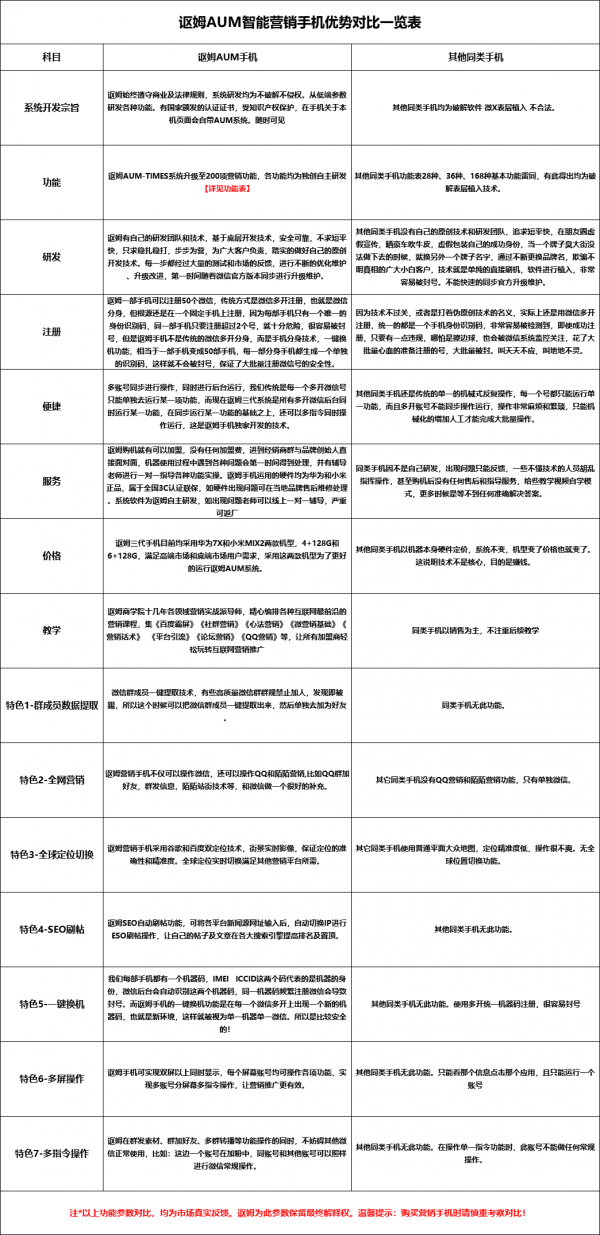 讴姆智能营销手机是专门针对微商和实体店以及做销售的人专门定制的一款商务手机!手机强大的200多项功能可以全方位的帮助各行各业的人来营销!比如:Diy定 点加粉、自动从群加粉、多账号后台自动加粉、群暴 力引流、一键转发朋友圈、一键群发5000人、多账号朋友圈自动同步、百群同步、自动点赞评论、自动回复、全球虚拟定 位百度seo等等功能,非常强大、实用,是做生意做销售做微商必备的微营销利器。对于微营销从业者而言,讴姆智能营销手机几乎已经是一种刚需品,正逐渐被越来越多的人所使用。微营销大势所趋,势不可挡,微营销工具必将迎来大爆发!讴姆大咖爱亚一五一九零三七九七零二等你来更加进一步的了解讴姆智能营销手机的优势