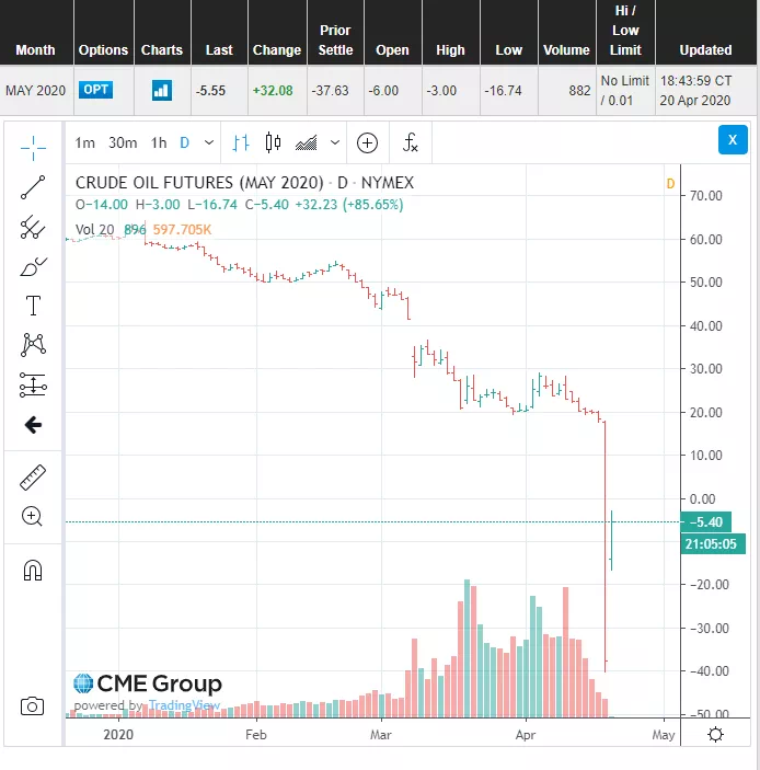 下图见证历史的时刻到了,悲催的美WTI合约终了跌破零点,定格在-37.63美元/桶的诡异收盘价上,让我们深刻地理解了资本主义和期货市场的凶险,又让中国的成品油定价机制情何以堪?!