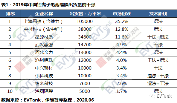 白皮书中对国内主要隔膜企业按照2019年的出货量进行了排名。十强企业榜单显示,上海恩捷和中材科技分别通过收购苏州捷力和湖南中锂实现了105000万平米和38000万平米隔膜的出货量,国内市场份额分别为35.2%和12.8%,2018年排名第二的星源材质退居第三名。前十强企业门槛为5000万平米。上榜企业中仅有武汉惠强和中兴新材只有干法技术,其他企业均是湿法或者干法湿法两种技术路线并行。