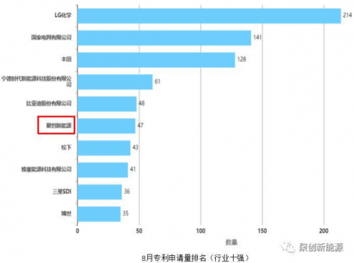 为此,宝能集团成立了创新能源科技有限公司自主研发动力电池,在2020年8月,聚创新能源科技有限公司跻身动力电池专利申请前十,以47件排名位列行业第六,仅次于LG化学、国家电网、丰田、宁德时代和比亚迪。