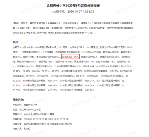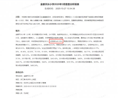 上、下半年学生视力检测,近视率有明显降低。通过上城区近视防控平台检测显示:2020年5月,学校近视率为49.18%,高度近视学生8人,高度近视率为1.01%,2020年10月,学校近视率为37.05%,高度近视学生3人,高度近视率为0.38%。