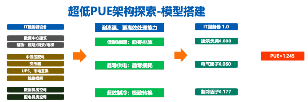 熟悉设计流程的专业人员都知道,数据中心里主要的设备是包含风电、制冷、IT,都属不同专业、不同团队的人来设计实施。其中,绝大部分设计院也不设计IT部分,而IT的负载通常是恒定值。为此,深总院搭建的能耗模型主要分为三个部分:建筑、电气、制冷。从绿色建筑层面来讲,目前低碳绿建趋势下,排放的趋势趋零。因此,降低PUE主要集中在电气和制冷两个层面:在电气领域,需要高能效的设备和最短的传输;在空调系统也是如此,超高效制冷,极致转换,这两个领域本质上都是将最简单的设备和最低的功耗结合起来,每一部分的PUE都控制到一定数值,最终实现整体PUE值的降低。