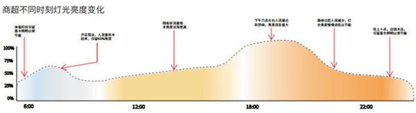 比如早上6点处于准备阶段,保留基本照明以便节能;9点开店营业人流量尚不大,保留60%亮度;12点后随着客流量增多,亮度逐渐提高;下午6点左右人流量达到顶峰,亮度调至最大;晚上9点后高峰过后人流减少,灯光亮度慢慢调低以节能;晚上10点超市准备关店,保留基本照明。