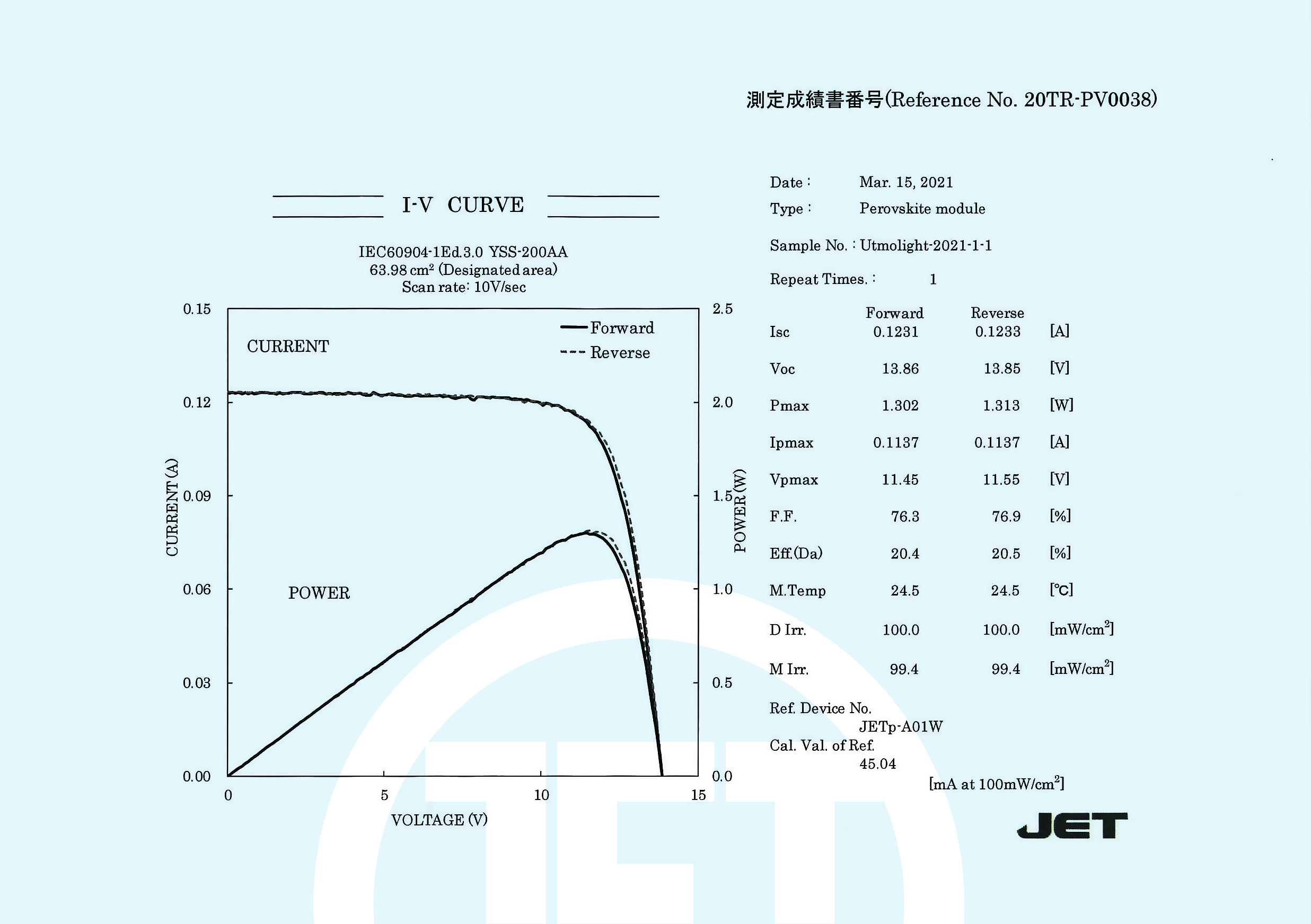 据悉,经全球权威测试机构JET(日本电气安全环境研究所)严格检测,极电光能在63.98cm2的钙钛矿光伏组件上实现了破世界记录的20.5%的光电转换效率。目前团队也将三大技术应用在30cm×30cm的更大面积的钙钛矿光伏组件上,预计效率将突破19%。