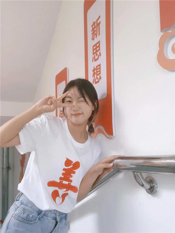 这款文化衫正面用中国红的色彩印制着河南省工艺美术大师、王氏刀书画非遗传承人王濮方的代表作品“善”字,背面印制有由齐(白石)派篆刻传人刘国亮精心创作的“崇德尚艺”篆刻印章,并搭配着“弘扬中华文化,建设文化强国”的首字母,左袖头印有“王氏刀书画”和“中国濮阳”的专属印记,设计范十足而且寓意深刻。