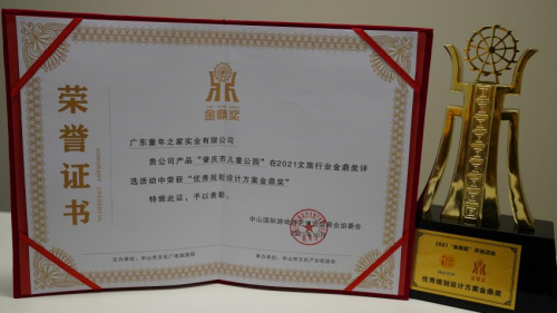 在开幕式现场组委会为2021“金鼎奖”获奖企业进行了颁奖仪式,童年之家集团以“肇庆市儿童公园”项目荣获“优秀规划设计方案金鼎奖”。作为中国无动力游乐设备领军企业的童年之家将继续为世界儿童创造优质儿童乐园!