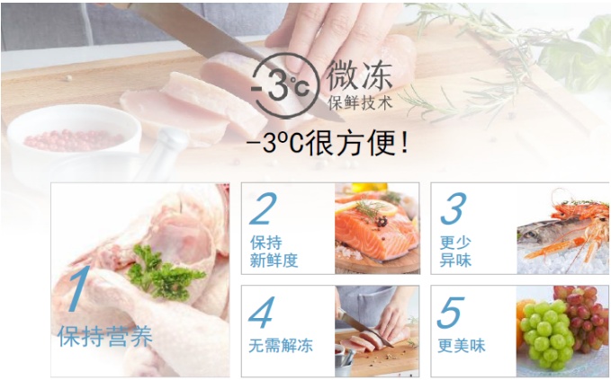 与零度保鲜不同,-3°C微冻保鲜仅使食物表面稍微冻结,不会损伤食物细胞,解冻时基本不会有血水、汁水溢出,最大限度保留生鲜食物的营养和口感,可以在有效时间内,保证肉质食物的美味不流失。同时用户使用肉质食材前不必解冻,节省烹饪时间。与冷藏相比,可以实现更持久的保鲜效果;与冷冻相比,则能够更好地维持美味度。