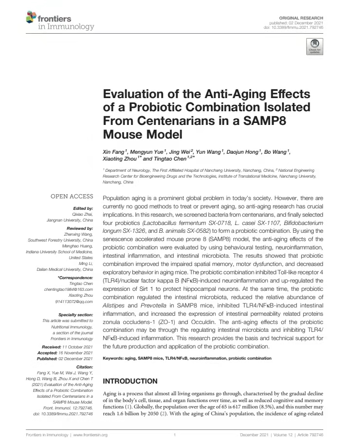 近日,南昌大学转化医学研究院陈廷涛教授团队发表在《Frontiers in Immunology》(“简称FImmu,国际免疫学学会联合会(IUIS)的官方期刊”)上的《在SAMP8小鼠模型中评价从百岁老人身上分离的益生菌组合的抗衰老作用》一文,引发了国内外肠道微生物组研究领域的广泛关注和讨论。