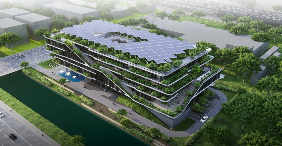 拟建的中建一局华东总部旨在打造成为上海市闵行区的标志性办公建筑,成为国家智能建造项目标杆和零碳生态建筑应用示范,并最终通过零碳建筑认证、绿建三星运营标识等。项目大量使用低碳混凝土、再生材料、固碳材料等绿色低碳建材,充分利用自然通风、自然采光、可调遮阳板、高性能外维护结构等被动式节能技术,以及智能照明、地源热泵、高效热回收新风系统等主动式节能技术,雨水回收利用系统每年预计节水3000吨,一级节水器具预计节水35%以上,高效热回收新风系统热回收效率超过70%,屋面铺装晶硅光伏面积超过1800㎡。