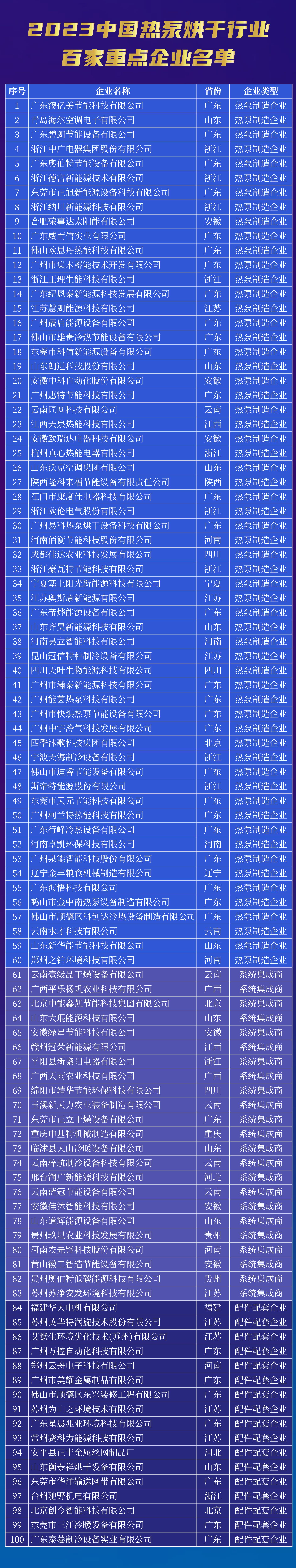 2023年7月30日,由中国节能协会热泵专业委员会支持、《热泵》杂志承办“2023中国热泵烘干行业百家重点企业推选活动”,经来自权威科研院所、知名院校、检测认证机构、标准制定组织、行业协会等部门的专家组成评审组评审,《2023中国热泵烘干行业百家重点企业》榜单正式对外发布。60家热泵制造厂家、23家烘干系统集成商、17家配件配套企业榜上有名。