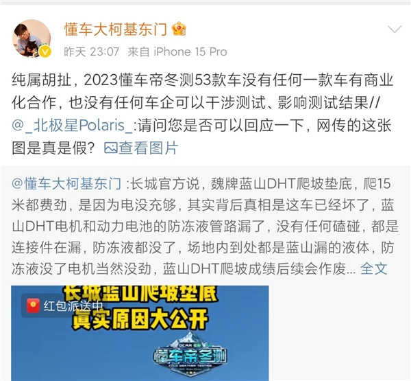 有关懂车帝2023冬测引发的讨论仍在持续,12月12日晚,微博标注为懂车帝原创主持人的“懂车大柯基东门”在其微博回应冬测商业化质疑,称“纯属胡扯,2023懂车帝冬测53款车没有任何一款车有商业化合作,也没有任何车企可以干涉测试、影响测试结果。”
