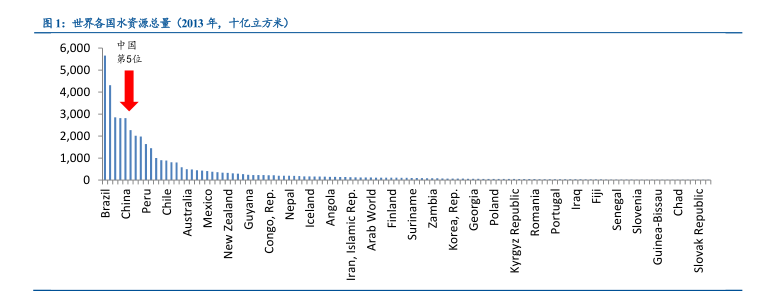 2013年我国水资源总量为2.8万亿立方米,居世界第五位,占世界总量6.5%;我国人均水资源量为2072立方米,排世界第102位,约为世界平均水平(6055立方米)的1/3,被列为世界人均水资源最贫乏的国家之一。据统计,我国2013年劣V类水占比高达15%,水资源形势严峻。