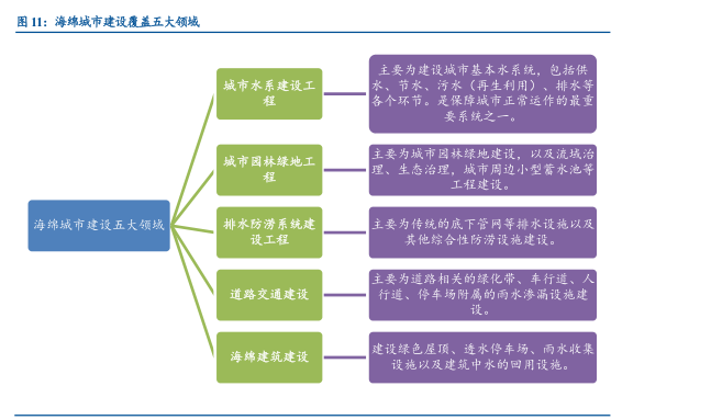 海绵城市是综合性城市建设项目,涵盖城市建设的方方面面,主要包括五大领域,即城市水系建设工程、城市园林绿地工程、排水防涝系统建设工程、道路交通建设、海绵建筑建设。