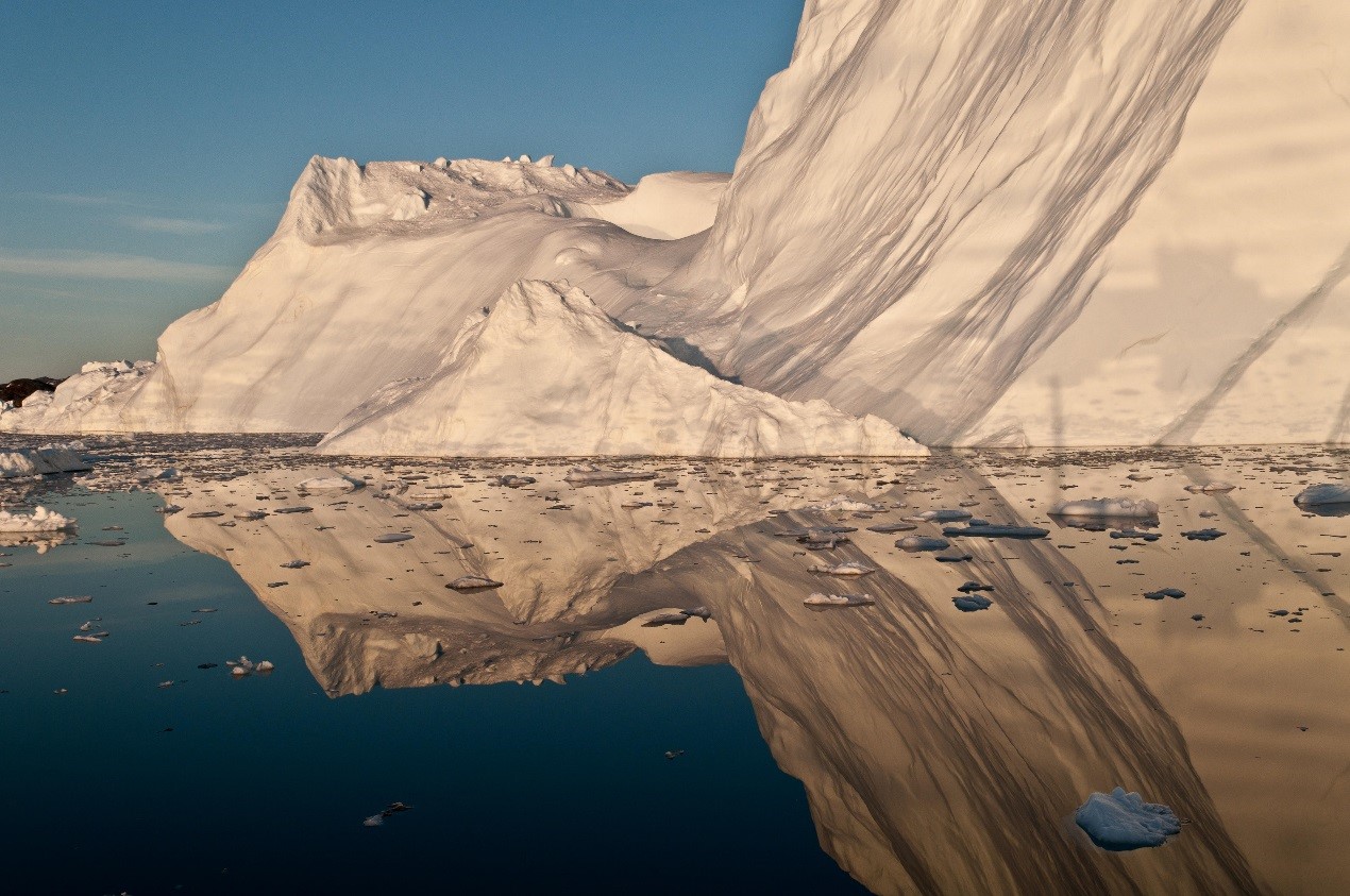 午夜的太阳在格陵兰岛Disko Bay的冰山上投射出金色的光芒,格陵兰岛每年的大部分的冰川损失都是由这样的冰山崩塌造成的。图片来自:华盛顿大学 伊恩•茹金