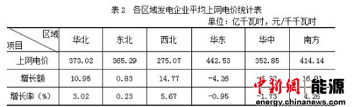 从区域看,华东区域平均上网电价最高,为442.53元/千千瓦时,依次为南方、华北、东北、华中,西北最低,为  275.07元/千千瓦时(见表2)。