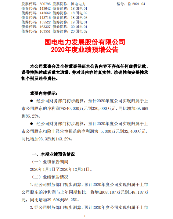 北极星风力发电网获悉,国电电力发布2020年度业绩预报,预计2020年实现归属于上市公司股东的净利润为240,000万元到320,000万元,同比增加39.69%到86.25%。