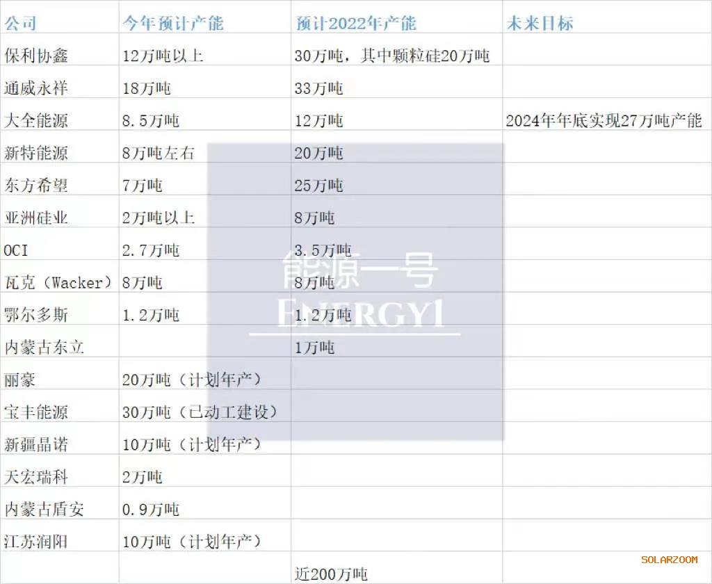 截至目前,包括通威股份、保利协鑫、大全能源、东方希望、特变电工等重量级巨头都分别公布了2022年的产能目标、扩产进度或产量实现情况,加上润阳、晶诺等多晶硅新企业都在陆续“上线”,明年预计多晶硅的总产能将走向近200万吨。(下图仅供参考,不确定是最终数据,以各大公司公布为准)