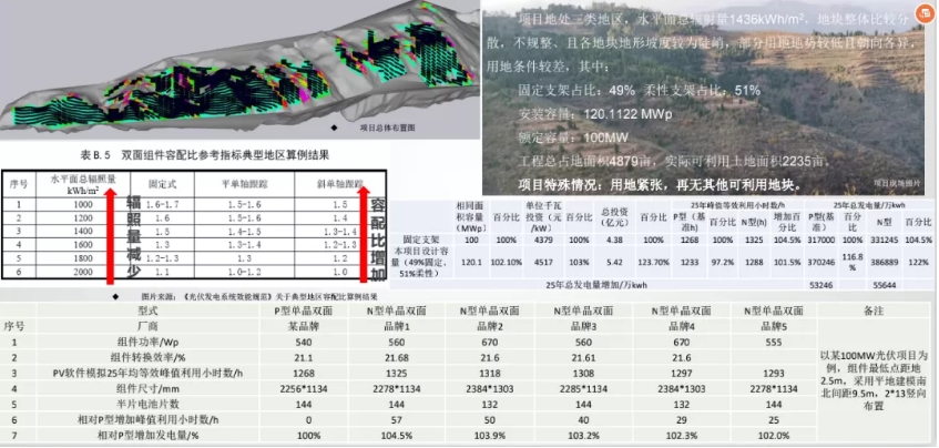 惠星举例道“西北某100MW电站,选址于5000亩左右的山地,但实际可利用面积仅为2200多亩,在以项目收益率为底线的情况下测算,其适合的融配比在1.5左右,但有限的土地不足以布置更多的直流侧装机。但是,在采用N型组件后,叠加柔性支架技术等多种方案组合,其收益率测算达标。如果不采用方案,该项目可能就推进不下去了。”