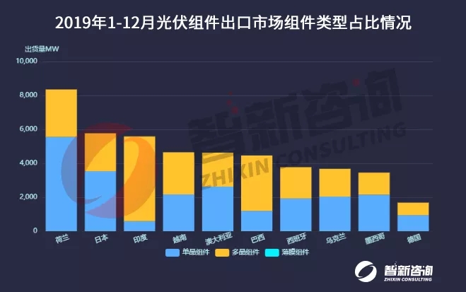 组件整体出口类型方面,单晶占比51.17%,多晶占比48.82%,薄膜占比0.01%。