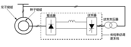 传统串级调速由调速装置等效地在电机转子回路串入等效电势,通过改变装置中逆变器的逆变角改变等效电势大小实现转速调节,同时将转子的转差功率反馈回电网而达到高效调速节能的目的.