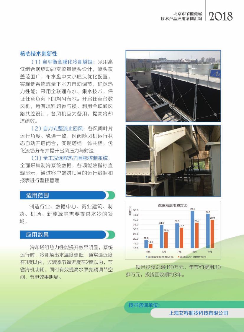 该技术采用全联通布水、集水塔组技术,消除变流量工况下对冷却塔组热力性能的影响;采用高低组合涡旋动能引流扩散喷头技术,实现变流量工况下塔组热力性能无波动、低衰减,节电率 15%左右。